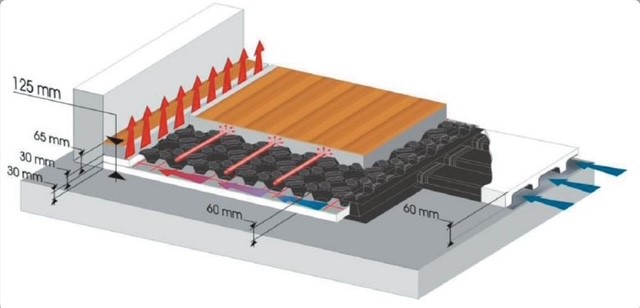 - De ventilatielucht wordt onder de vloer verder op de gewenste temperatuur gebracht door stralingswarmte / koelte aan de onderzijde van de vloer over te nemen in de dynamische velden.